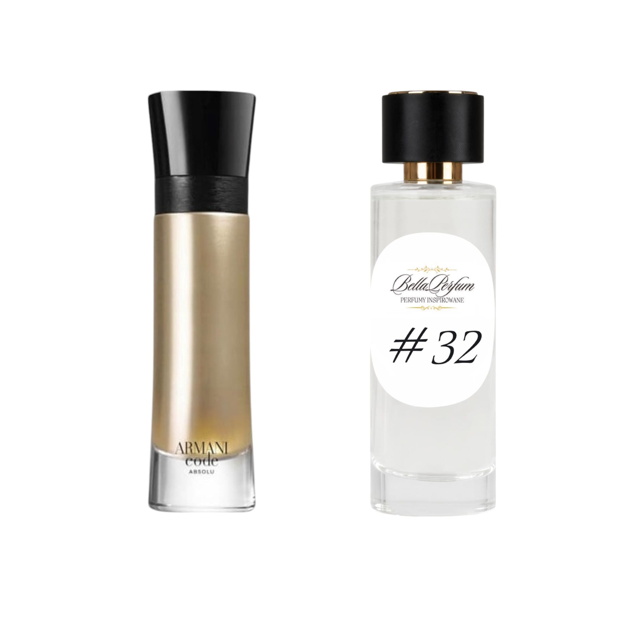 Bella Perfum Nr 32 to perfumy męskie inspirowane Armani Code Absolu. Orientalno-przyprawowa kompozycja z 21% zaperfumowania w dużej butelce.